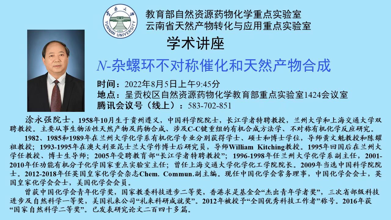 【学术报告】N-杂螺环不对称催化和天然产物合成